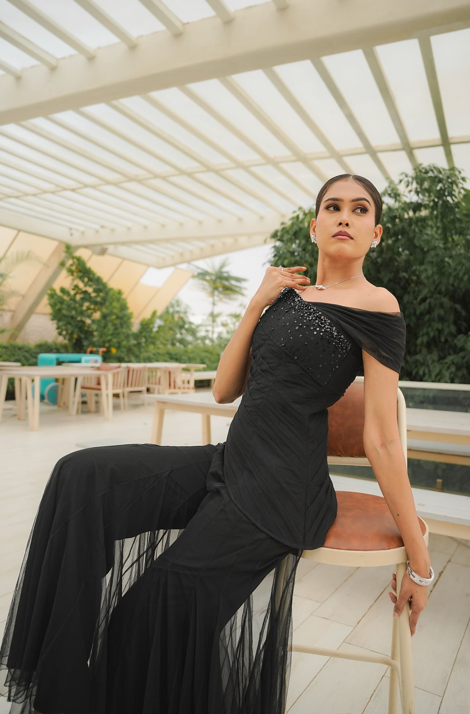 Striking yet graceful, the Off-Shoulder Beaded Top redefines evening sophistication. Draped and pleated to perfection, the silhouette contours the body with sculptural precision, while the off-shoulder neckline creates a soft, romantic frame.