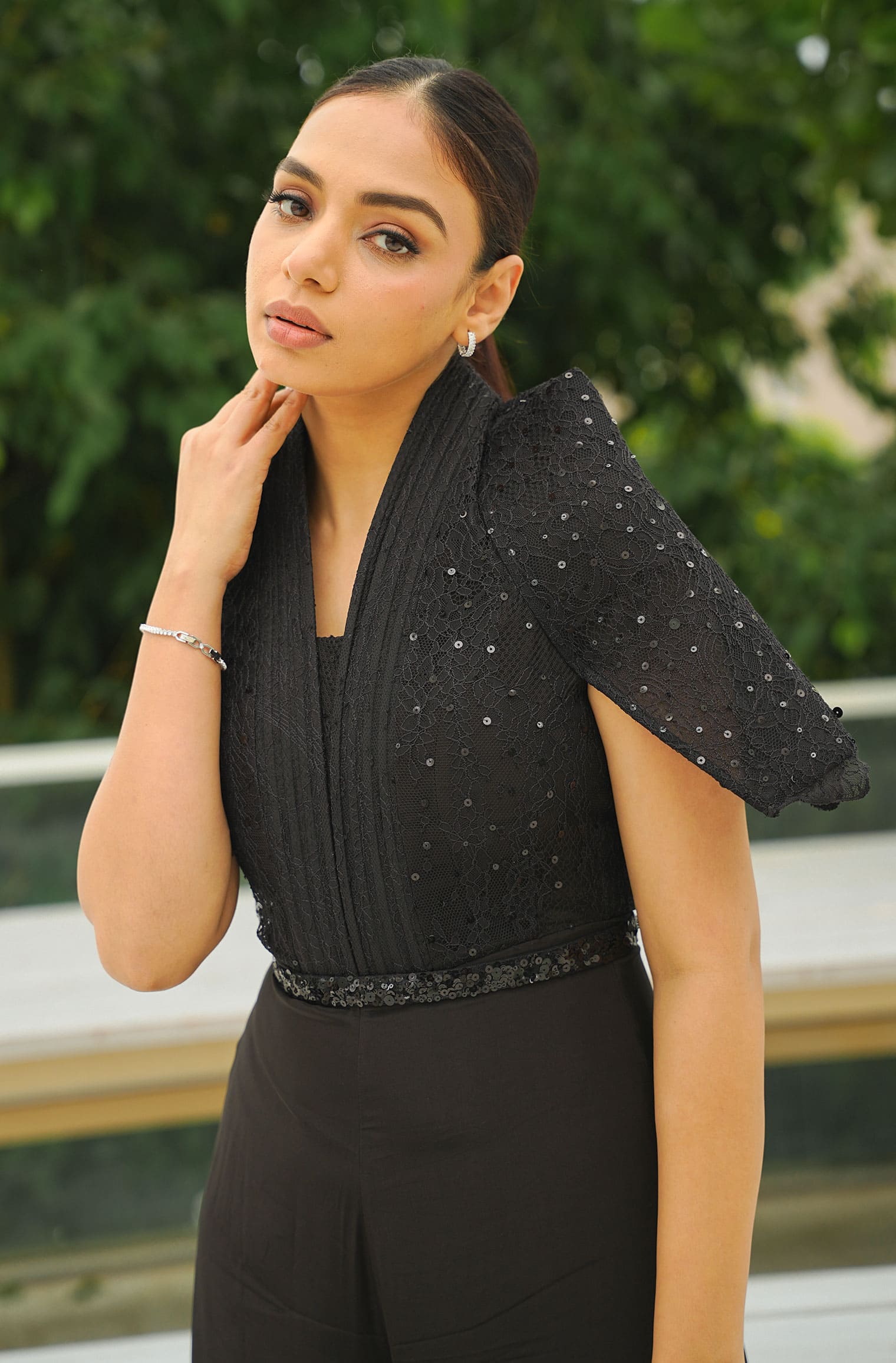 Striking and sophisticated, the Sleeve Lace Jumpsuit redefines power dressing through elegant craftsmanship. The bodice is adorned with hand-embroidered sequins that shimmer with subtle restraint, while the sculpted lace sleeves introduce a dramatic architectural element to the silhouette.