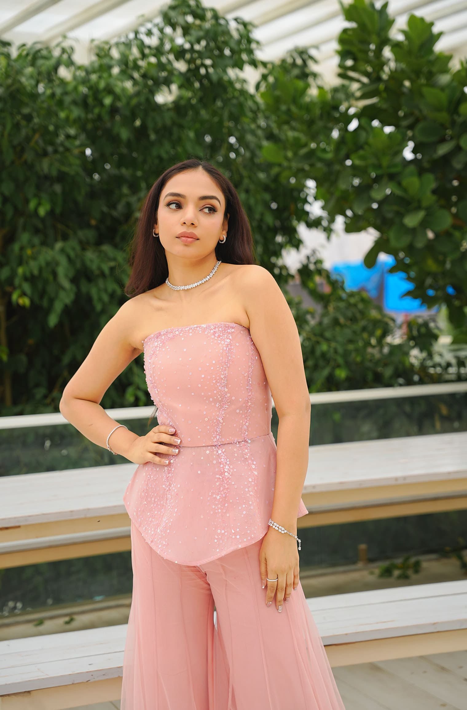 Modern structure meets feminine luminosity in the Pink Beaded Peplum Top. Crafted in a soft blush hue, this sculpted piece features a triangular peplum form that gracefully defines the waist while creating movement through its layered volume.