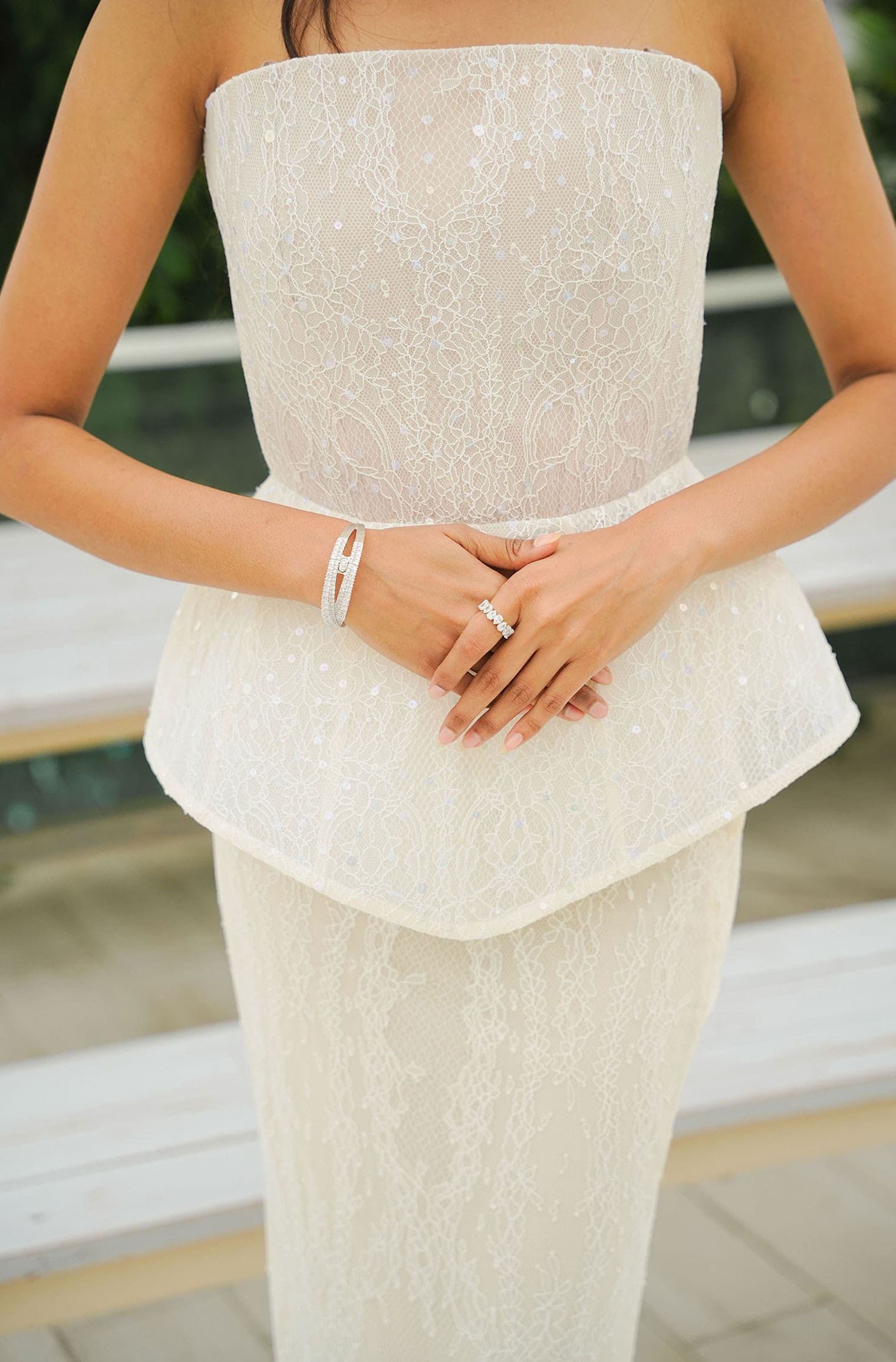 Elegant and architectural, the Ivory Peplum Corset Top reflects a delicate balance between structure and softness. Crafted from fine Chantilly lace layered over mesh and georgette lining in a soft skin tone, it features subtle hand embroidery in sequins that lend a quiet shimmer under light.