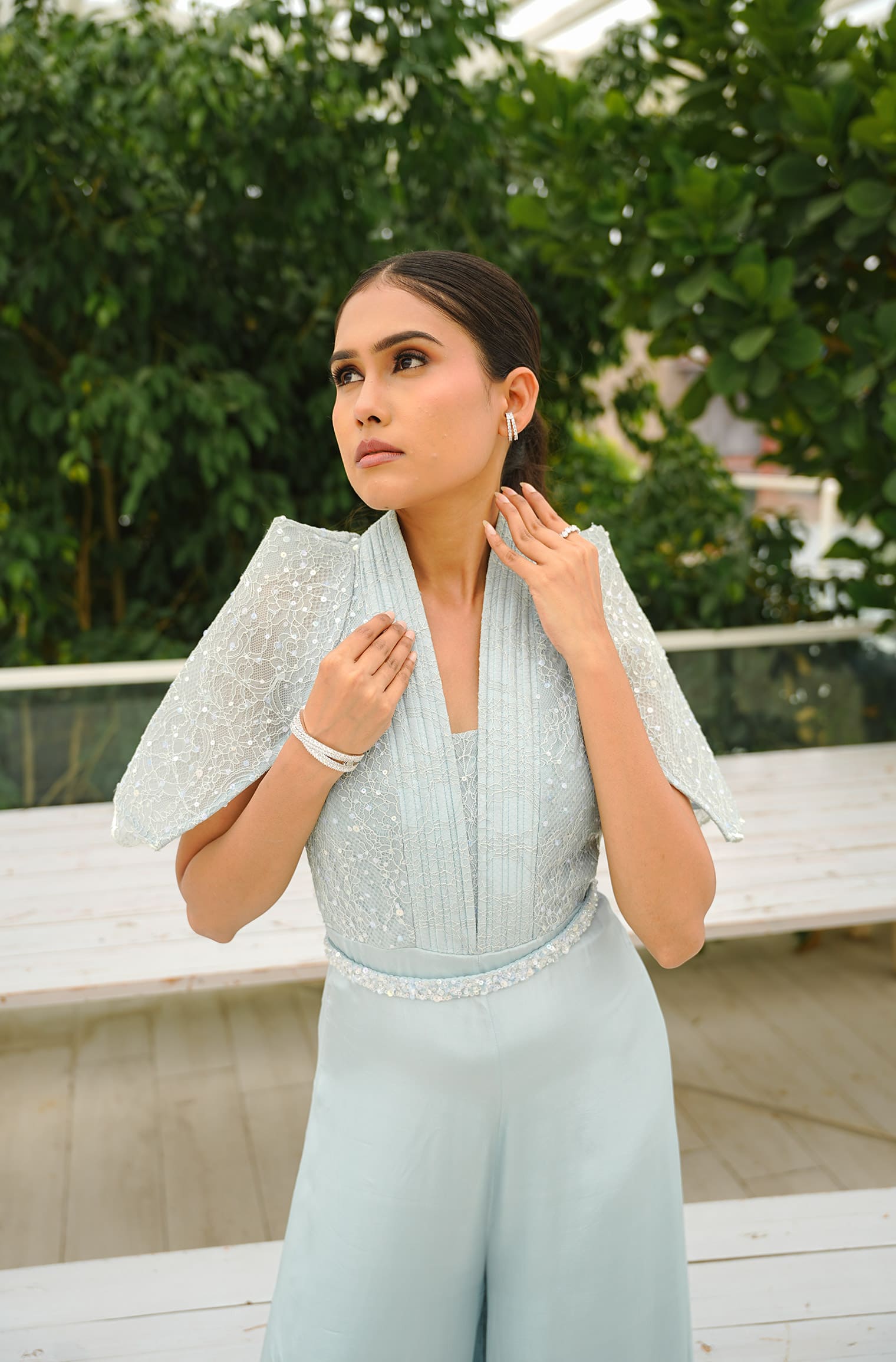 Softly structured and effortlessly fluid, the Sleeve Lace Jumpsuit in powder blue blends architectural precision with modern grace. The bodice features intricate hand-embroidered sequins that glisten subtly, complemented by sculpted lace sleeves that frame the shoulders with contemporary elegance.